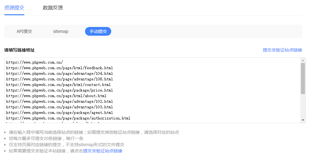 手动提交网址是把每天新增或修改的网页页面地址手动推送给百度,每次最多推送只有20条。