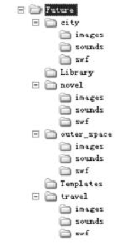 其中,Future为站点的根文件夹,在根文件夹下根据网站不同的主题可分为“未来都市”、未来旅游(travel))、未来太空(outerspace)、科幻小说(novel)等等栏目,每个栏目分别对应不同的内容。而每个主题所有文件均放在文件夹中,然后再进一步地细分文件类型