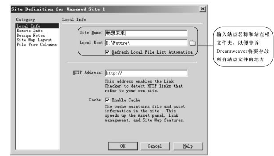⑤“Cache(缓存)”选项默认情况下也被勾选,这表示创建高速缓存以加快链接和网站管理的处理速度。因为当对文件进行改名、移动、删除操作后,原来指向这个文件的链接会断开,而勾选了“Cache”'就可以及时发现问题,并加以纠正(建议使用)。