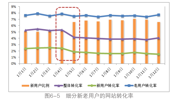 图6-5展示的是1月份前几天每天细分新老用户的网站转化率变化趋势,同时加入了新用户比例的数据,从图表上看,1月4日之后整体转化率的趋势有明显的下滑,同时新用户比例明显上涨,可能网站展开了新一轮的推广。我们需要分析整体转化率的下降与网站的推广是否存在必然联系,于是需要细分新老用户的转化率,上图中老用户的转化率几乎维持不变,而新用户的转化率也从1月4号后开始出现下滑,所以通过用户细分后的转化率趋势分析,基本上可以判断网站整体转化率的下降是由于网站推广带来的新用户转化率过低导致的,与网站本身的运营没有关系。所以还是那句话,老用户是网站建设生存的基础,新用户是网站发展的动力,细分老用户的数据可以分析网站当前的根基是否牢固,同时排除网站营销推广的干扰;细分新用户的数据可以分析网站营销推广中引入的流量质量,同时消除了凭借原始积累的“吃老本”的情况。